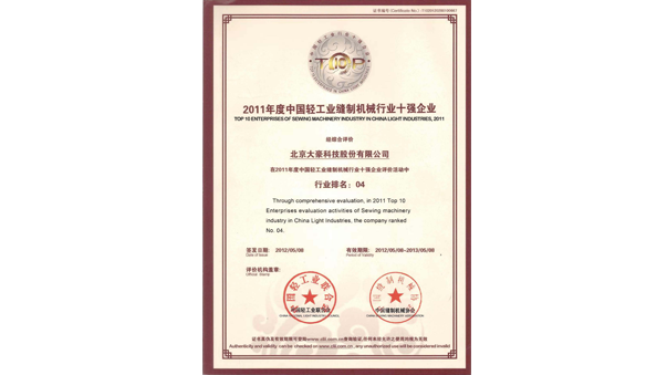 大豪公司被中国轻工业联合会、中国缝制机械协会评为“2012年度中国轻工业缝制机械行业十强企业”