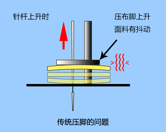 普通刺绣机压脚是固定在针杆上的,与针板的距离是固定的,压脚驱动行程过大,在超过1000转高速运转下,压脚弹簧对压脚凸轮的冲击很大,机头震动和噪声都大大增加,并且压脚凸轮寿命很难保证。