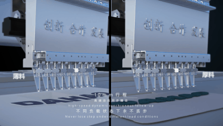 针对上述市场应用情况,大豪科技与刺绣机整机厂兄弟企业合作开发了步进闭环独立压脚产品。采用步进闭环驱动技术,实现了自动控制压脚高度、压脚行程,优化压布时间,降低断线率,有效防止所绣面料颤动走位,使其适用于皮革、厚布料、弹性面料,绗缝夹棉等各式各样面料,提升精美刺绣新标准。
