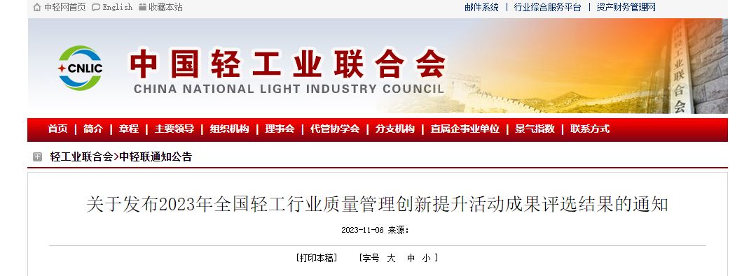11月6日,中国轻工业联合会发布2023年全国轻工行业质量管理创新提升活动成果评选结果的通知。尊龙凯时科技股份有限公司“改进江湖QC小组”,荣获“2023年全国轻工行业优秀质量管理小组”荣誉称号。