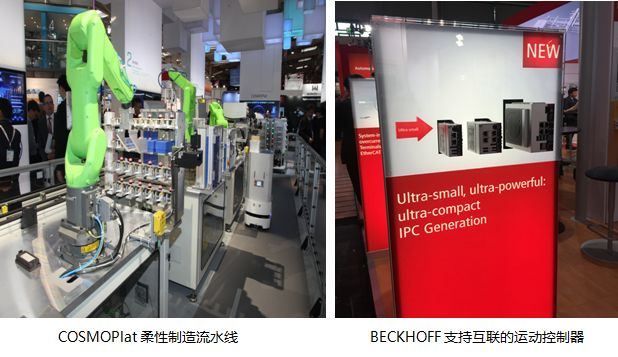 我们重点参观了集成自动化和数字化工厂两大类展馆。集成自动化馆包括了机器人技术、图像处理技术、能源传输和控制技术、无线传输技术多个主题。而数字化工厂馆包括了电脑图像模拟、数字化工厂、仿真技术等多个主题。比较印象深刻的是KUKA和ABB工业机器人的使用,几乎大多数的展台有工业机器人的应用展示,有的是机器人现场开啤酒,然后再一手拿杯一手倒酒,动作流畅柔和;有的是流水线线上多组机器人协同工作完成复杂零件组装。机器人技术的使用提高了劳动效率、加工精度,同时为定制化生产提供了基础。展会上海尔个性定制化冰箱生产流水线,也是机器人技术在智能制造方面的展示。华为展台展示了工业数据采集的整套方案:工业现场的各类传感器信号、电机动作情况等信息被汇总,并通过互联模块把数据采集存储到云平台,进行大数据的采集和分析。当然,华为的5G技术展示也很吸引人,利用5G技术实现2ms间隔的实时运行控制,使机器人手托平台放上小球运行不掉落。在BECKHOFF看到了直线电机的应用,运行更平顺、更高速,基本感觉不到振动,如果能将这种直线电机结构应用到缝制设备上,那将会是质的飞跃。BECKHOFF也发布了其全新的运行控制器IPC模块,基于EtherCAT总线互联,模块化方便互联组成更大的控制网络。