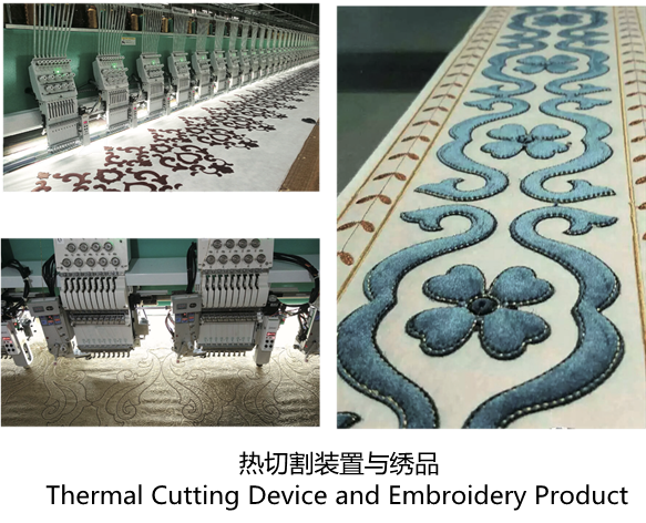 大豪热切割电控解决方案,可以实现平绣机成熟产品全部功能和性能的基础上,在首、末针位加装热切割装置,实现了大豪电控与热切割装置系统的完美连接。大豪热切割系统可实现切割、雕孔功能,大大丰富了刺绣功能。尤其在窗帘、墙布等刺绣市场,用热切割装置实现切边、雕孔、镂花等工艺,更好地满足了广大客户实际绣作过程中的需要。