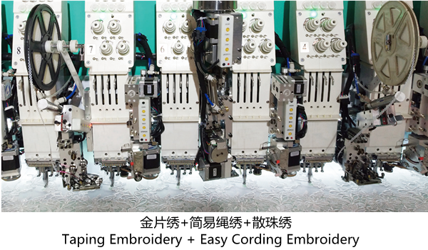 简易绳绣作为一种基于平绣机头的附加装置,实现了分头控制的绳绣(又称锯齿绣、Z绣)功能,绣作效率也有显著提高。简易绳绣装置不占用单独机头位,并且和金片装置一样,可以加装在首、末针位置,有效的节省空间,安装方便,简单易用,绣做速度可以高达1000转,补绣质量和生产效率也得到很大提高,受到了用户的普遍欢迎,已经替代了传统盘带绣机型的绳绣功能,真正实现了速度与绣品质量的结合,是一款性价比较高的特种刺绣功能。