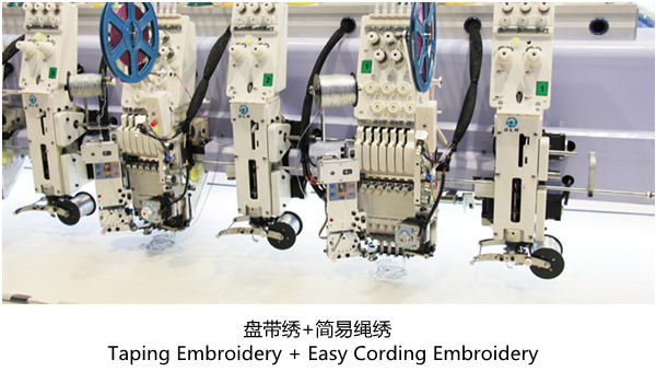 随着简易绳绣装置作为一种经济型绳绣实现方案逐步为市场接受,在原有平绣、盘带绣、金片绣三合一机型基础上,平绣机头增加绳索绣装置,配合盘带绣装置,也可以实现多种绳绣和缠绕绣、带绣组合绣品效果。大豪电控支持同一台机器上实现盘带绣和绳索绣的组合,并可以独立设置参数。